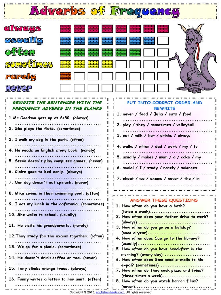The present pdf contains some questions about adverbs of frequency. Once a month we go to our favourite restaurant. Put the adverb in the right place in the sentence An adverb of frequency tells us how often something takes place. Hourly, daily, weekly, monthly, yearly. Our dad never gets off work before 6:00. Jack sometimes go to bed after midnight.) Put the words in the correct order to make sentences, as in the example. At the beginning of the sentence. Can you find an 12 example of the frequency word that can come before the subject? Learn what are adverbs of frequency, types of these adverbs and how to use them in english sentences with interesting examples and free esl picture. Top an adverb describes a verb. We can use adverbs of frequency to talk about how often we do something.